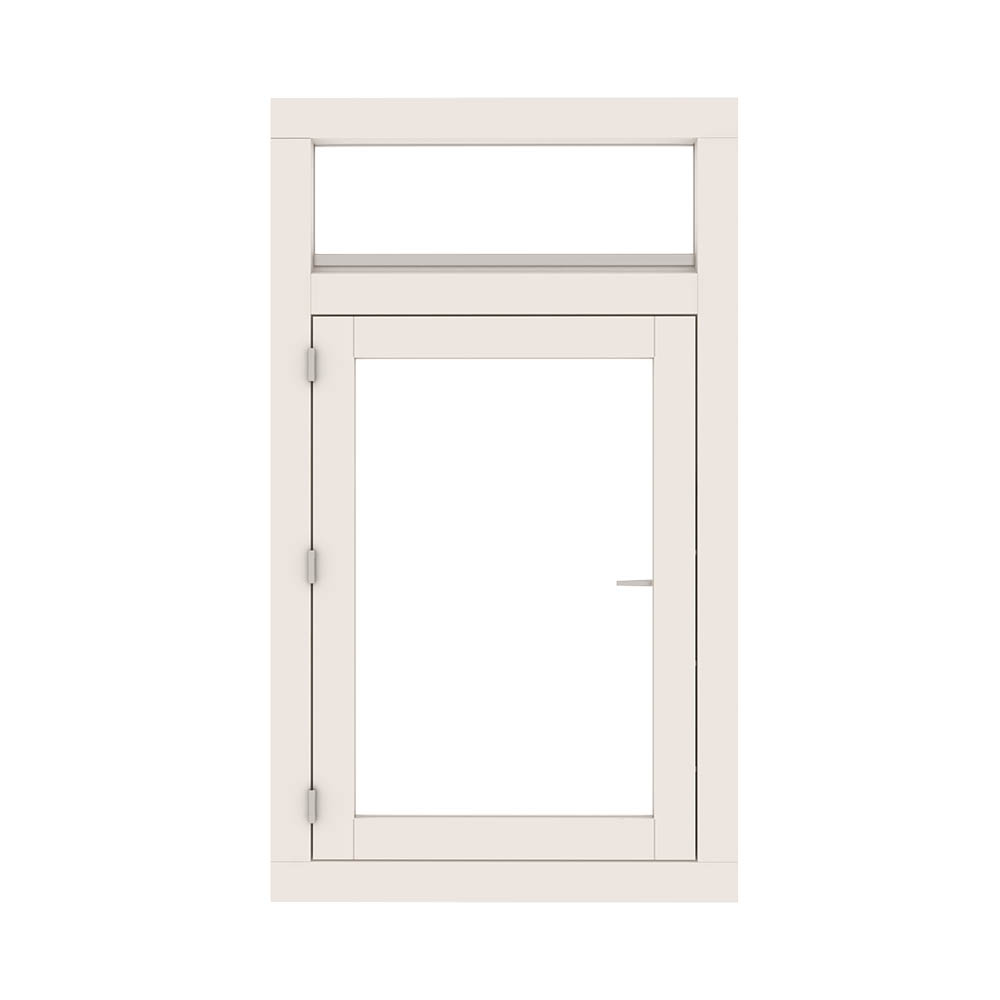 Dit houten kozijn bestaat uit 2 vakken die boven elkaar zijn geplaatst. In het onderste vak zit een draairaam die naar buiten draait. Dit kozijn wordt vaak geplaatst in een keuken of bijkeuken.