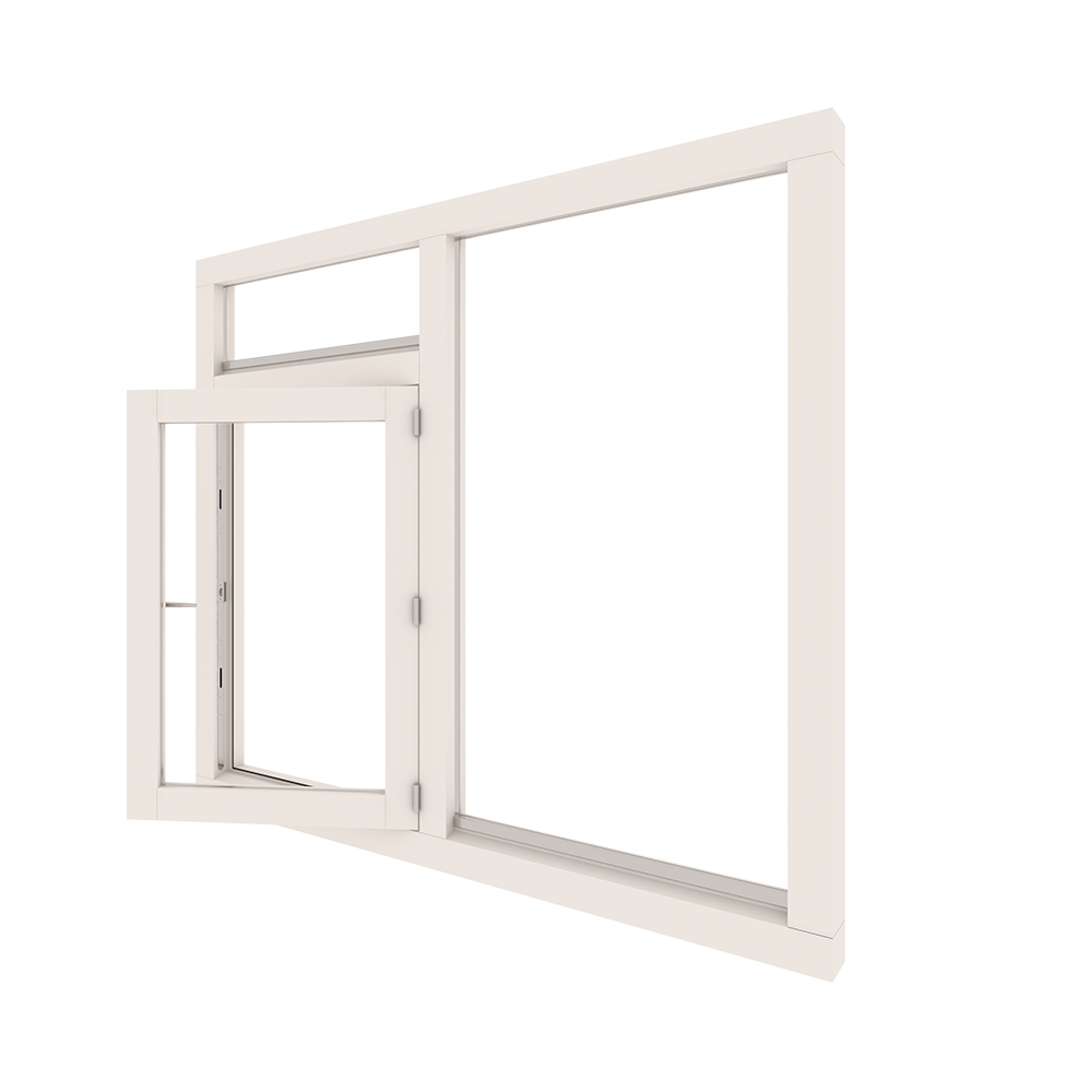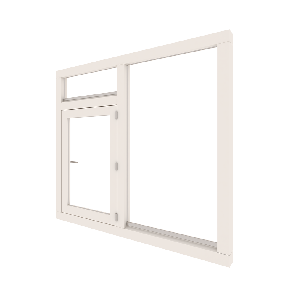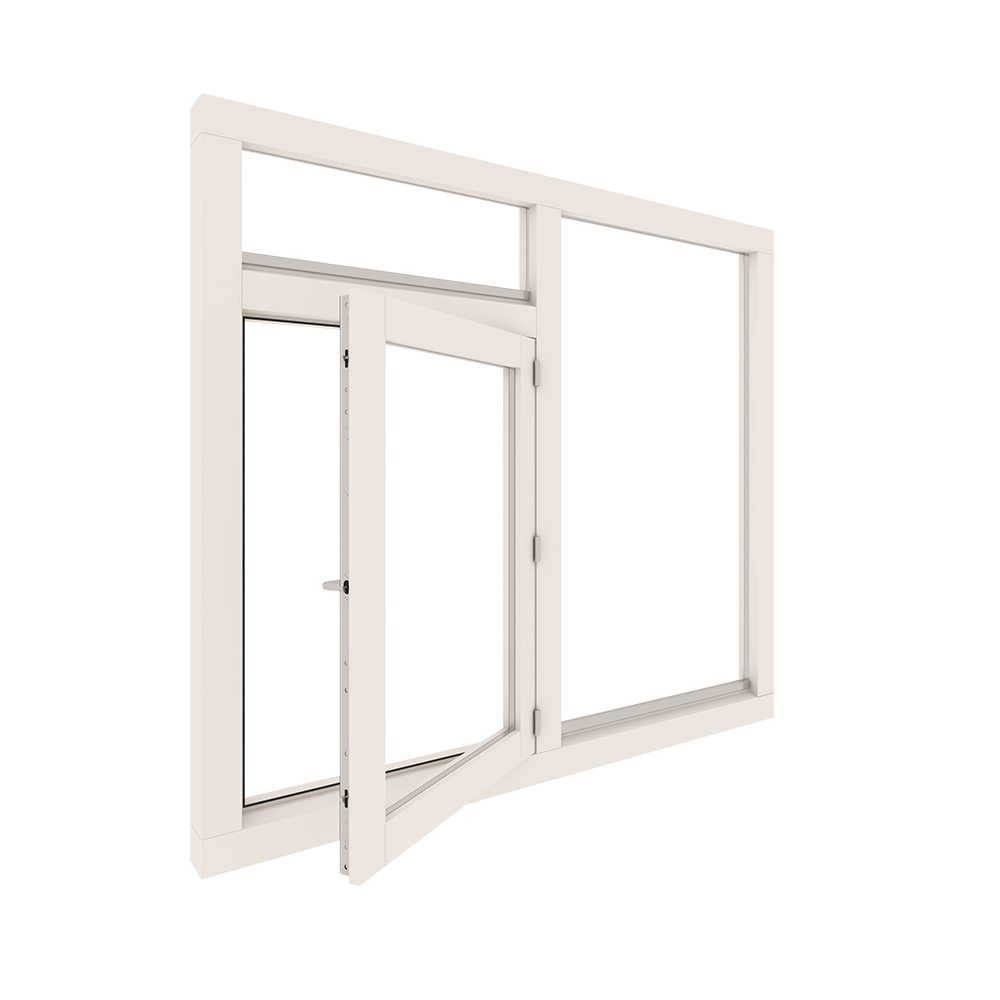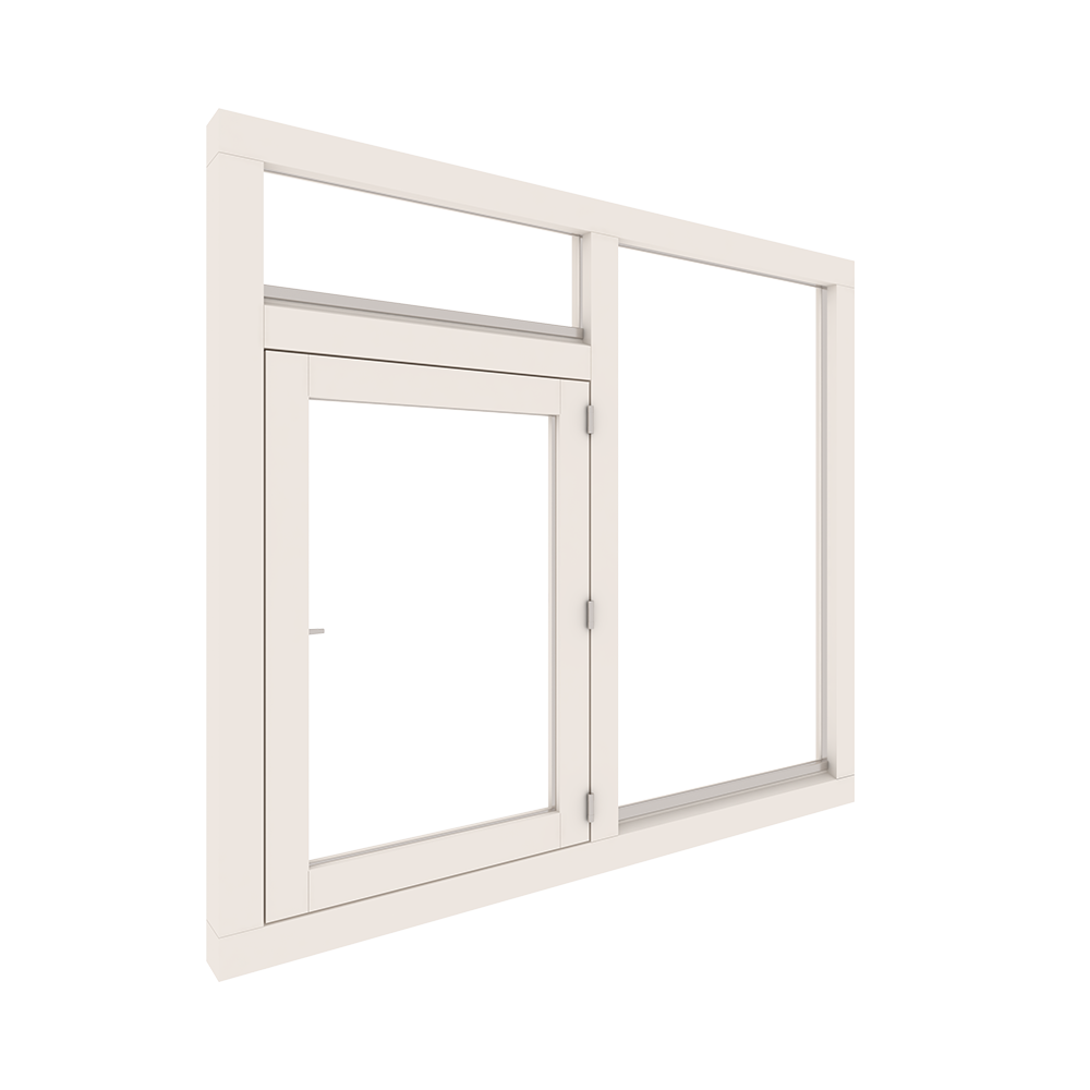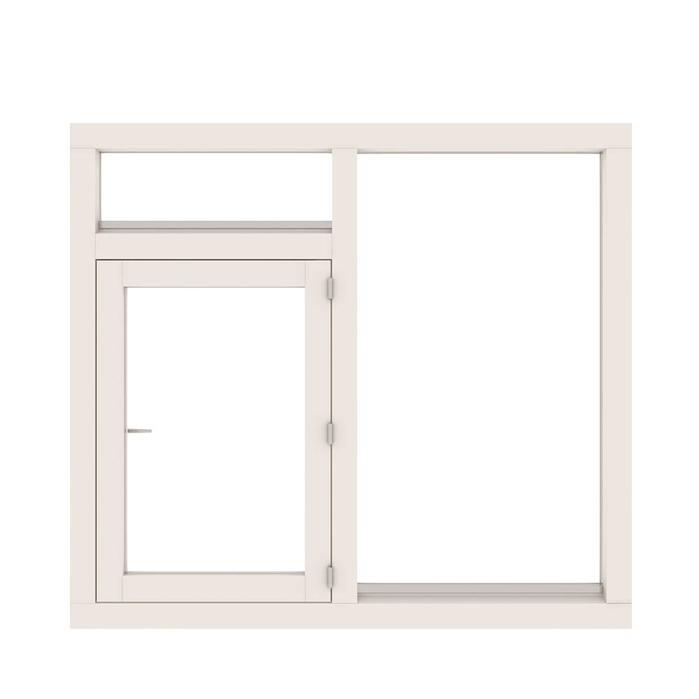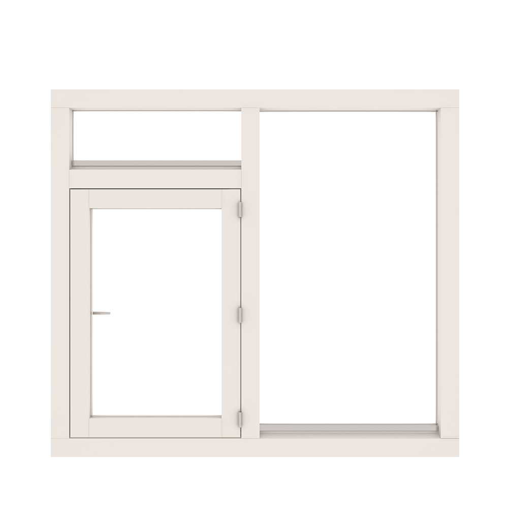 Dit houten kozijn bestaat uit 3 vakken die samen een vierkant of rechthoek maken. Het raam wordt eerst in 2 vakken naast elkaar gesplitst. Het linkse deel wordt uiteindelijk opgesplitst in 2 vakken boven elkaar. In het onderste deel komt een draairaam die naar buiten draait. Dit kozijn wordt veel gebruikt aan de voorkant van een woning.