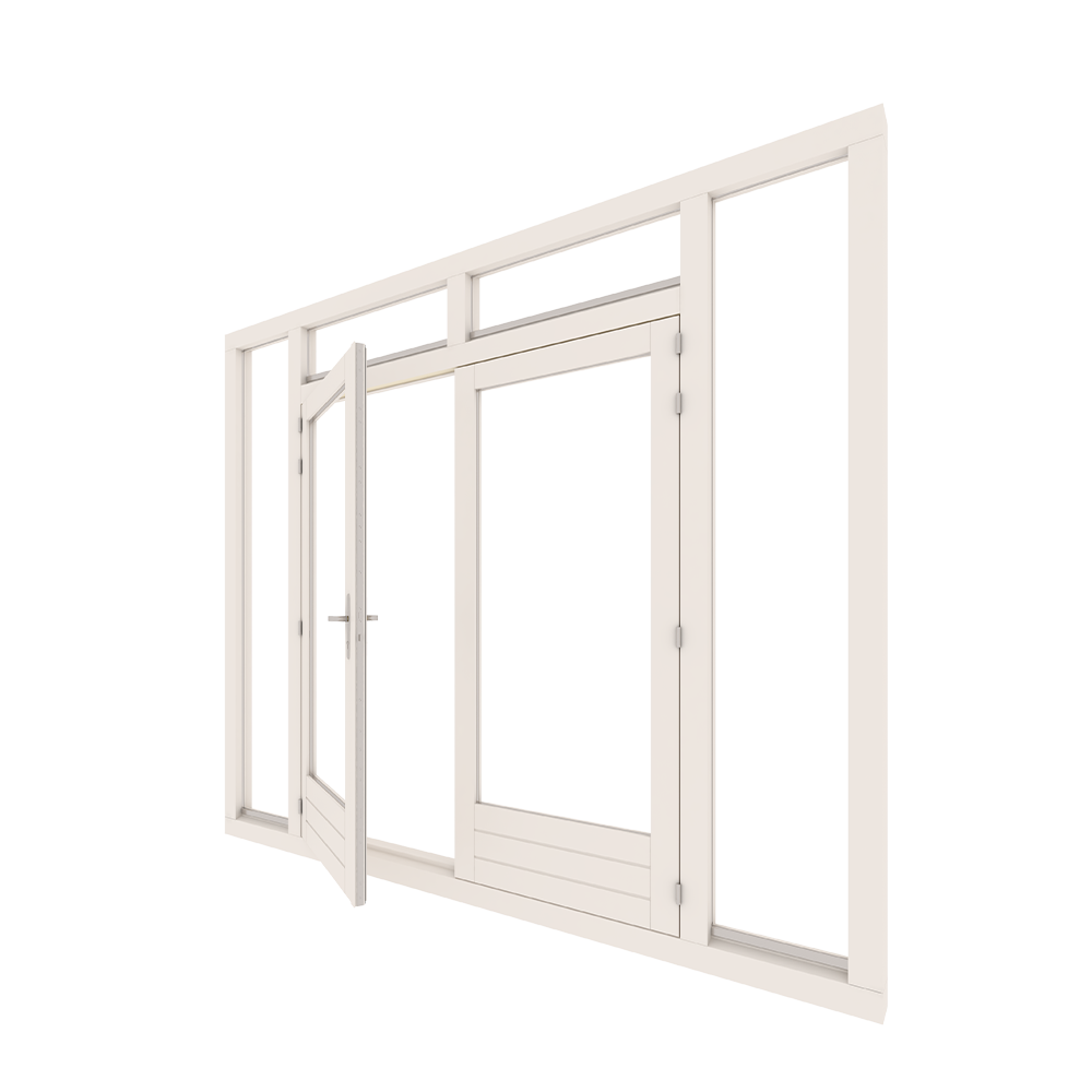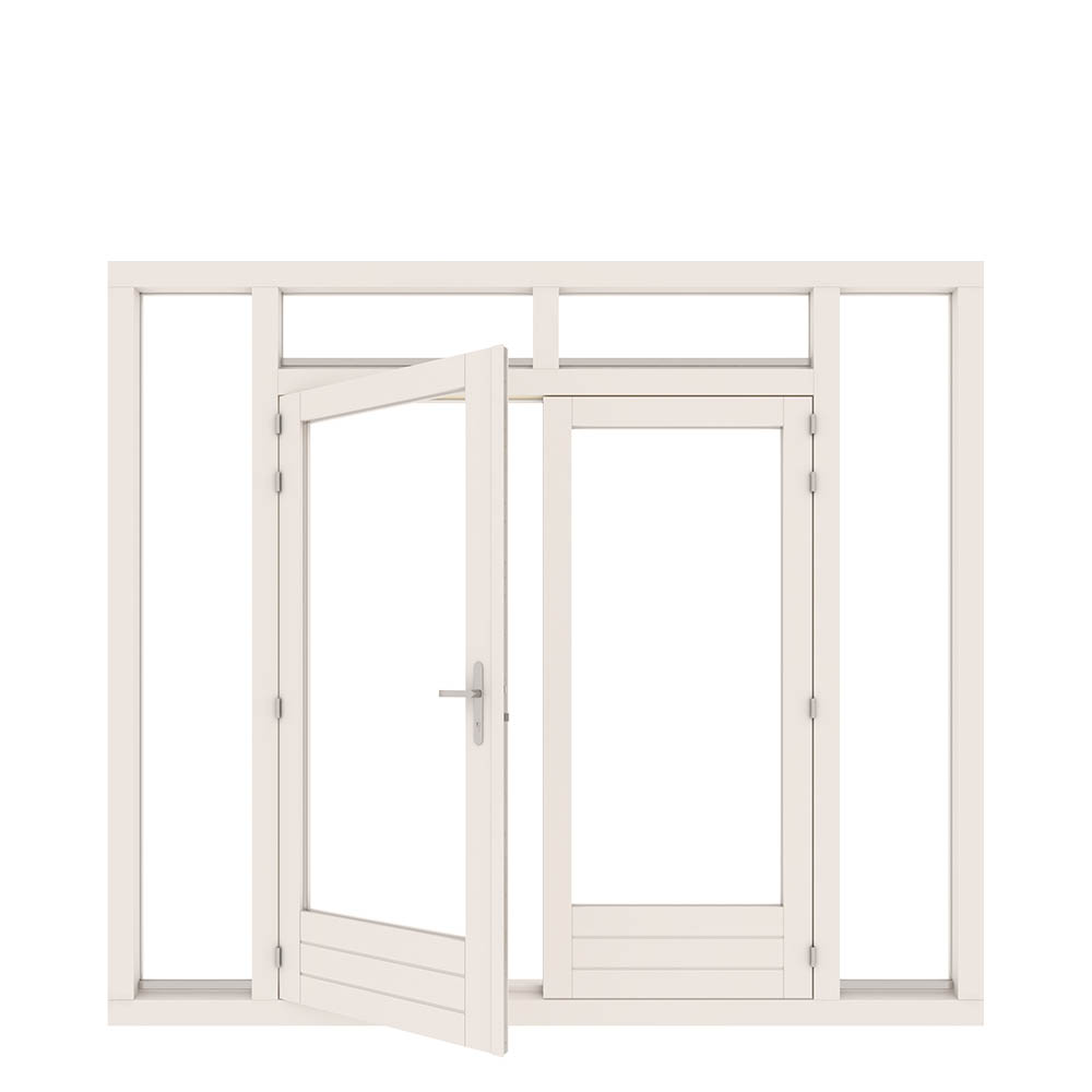 Deze tuindeur heeft dubbele openslaande deuren. Boven de deuren worden naast elkaar 2 bovenlichten geplaatst. Je hebt de optie om in de bovenlichten klepramen te plaatsen. Aan de linkerkant en de rechterkant van de deuren wordt een raam in de totale hoogte geplaatst. De deur wordt rondom voorzien van een tochtstrip. Hierdoor heb je geen last van geluid en tocht binnen. Door de vele opties in ons stappenplan is bijna alles mogelijk.