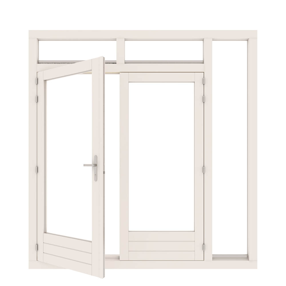 Deze tuindeur heeft dubbele openslaande deuren. Boven de deuren worden naast elkaar 2 bovenlichten geplaatst. Je hebt de optie om in de bovenlichten klepramen te plaatsen. Aan de rechterkant van de deuren wordt een raam in de hoogte geplaatst. Dit is een zijlicht. De deur wordt rondom voorzien van een tochtstrip. Hierdoor heb je geen last van geluid en tocht binnen. Door de vele opties in ons stappenplan is bijna alles mogelijk.